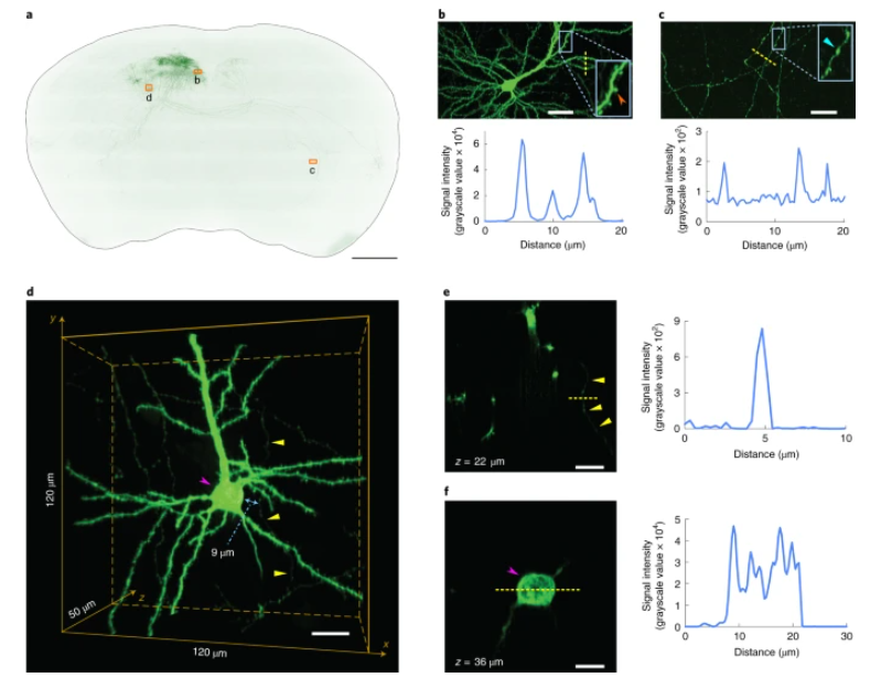 团队提出的LiMo显微术在快速高分辨率光学成像时能显著提高背景抑制能力。在此基础上发展的HD-fMOST技术不仅极大提升了全脑光学成像的数据质量,而且对该领域面临的大数据难题开辟了全新的解决途径,在数据存储、传输、处理和分析等方面效率显著提升,有望在标准化、规模化的脑科学研究中发挥巨大作用,为绘制单细胞分辨的介观脑图谱贡献一份力量。